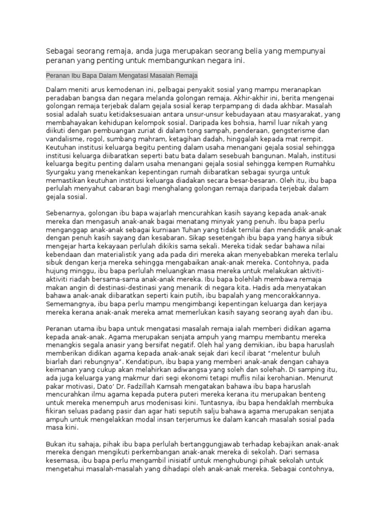 Hal ini menunjukkan bahawa betapa pentingnya bekalan ilmu pengetahuan. Peranan Ibu Bapa dalam Usaha Menangani Masalah Sosial Remaja. Koleksi Contoh Karangan SPM Bahasa Melayu Sijil Pelajaran Malaysia Berikut adalah contoh-contoh karangan mengikut tema yang selalu digunakan sebagai tajuk soalan karangan Bahasa Melayu.